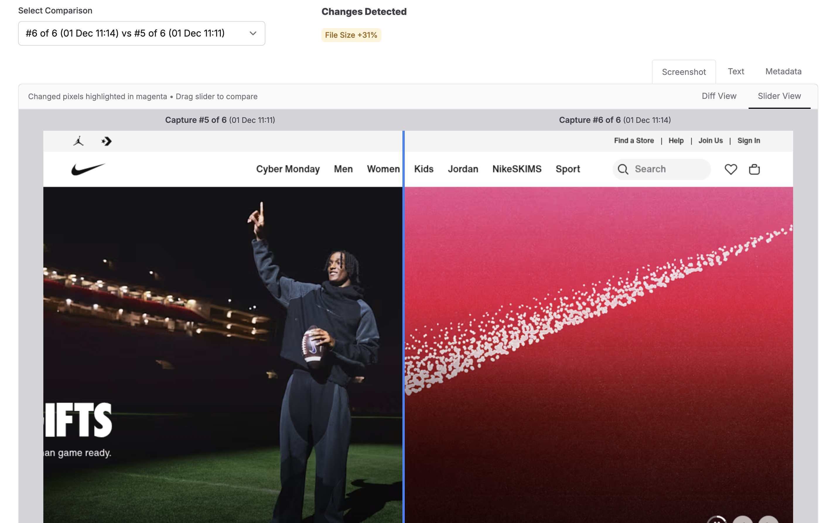 Diff View highlights exactly what changed, marking the differences from your last capture in magenta. This makes it easy to spot text updates, moved elements, a completely different height screenshot, or subtle changes:
