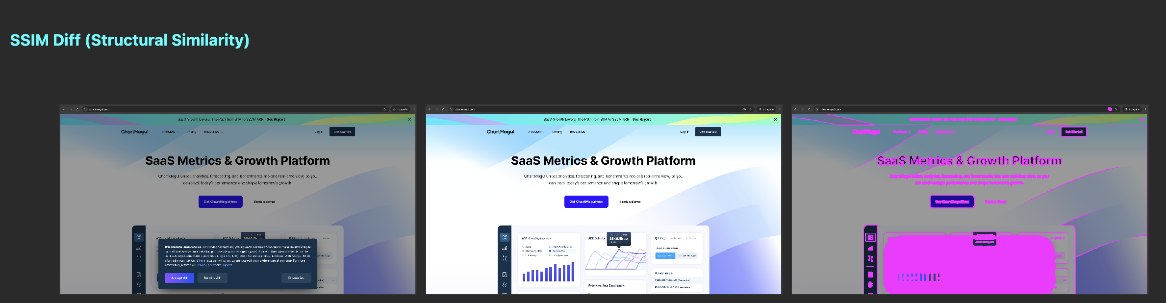 What's great about this comparison is that though the cookie banner itself is still detected as a change, the darker overlay surrounding it isn't seen as a change.
