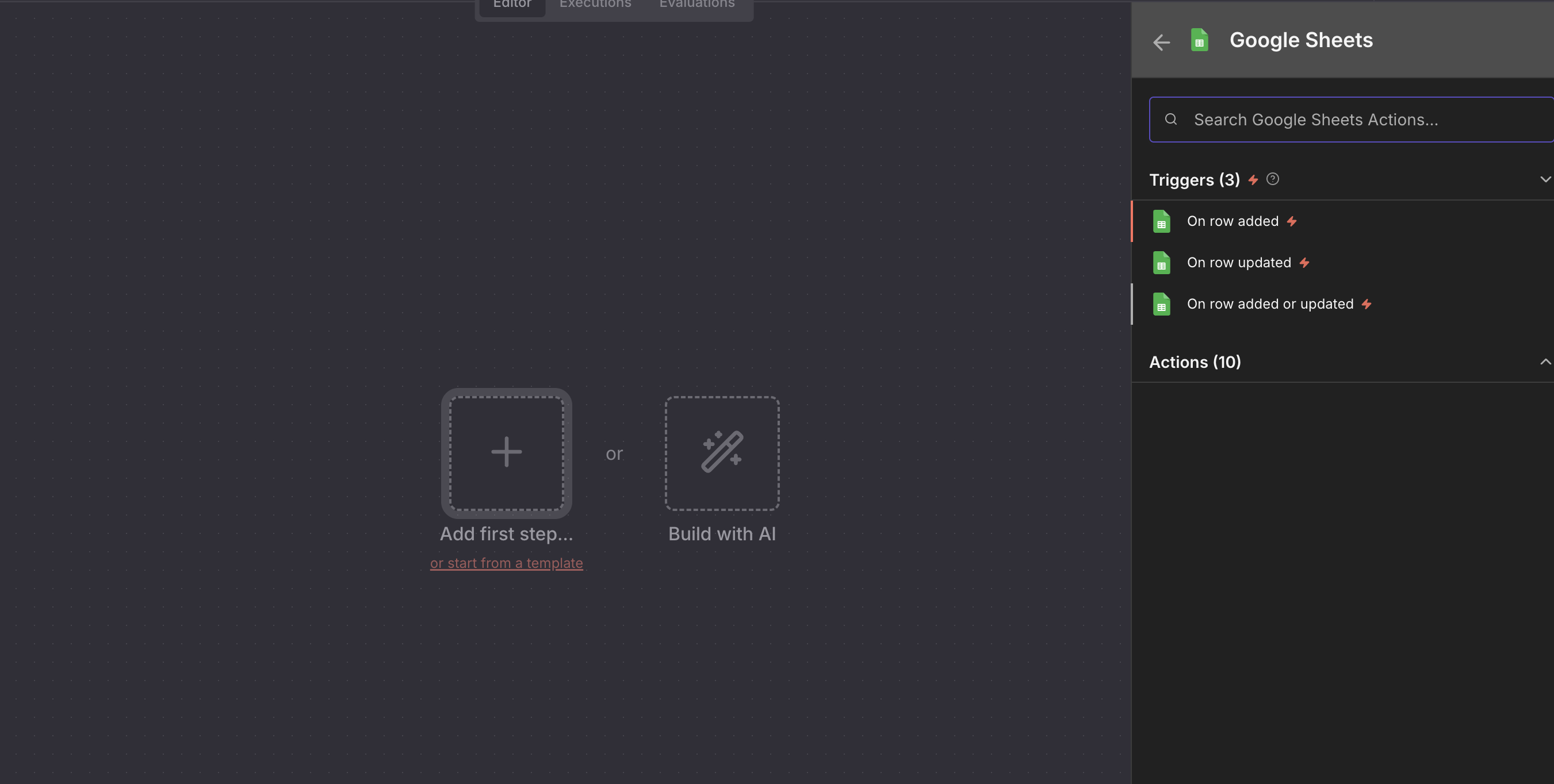 Hit 'Add first step' and search for Google sheets, then select the Trigger 'On row added or updated'.