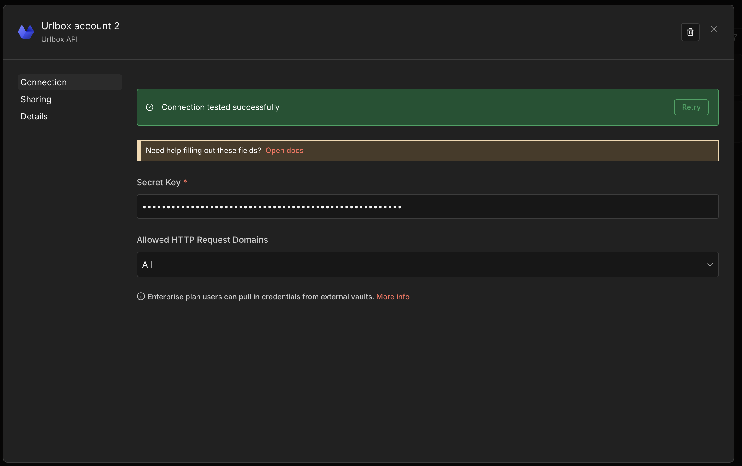 Create a new Urlbox credential (you're prompted from the N8N node if you've not made it before), pasting that key here: