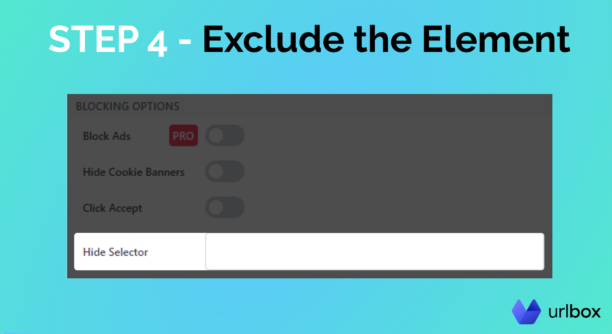 You'll need to scroll until you see the "Hide Selector" blocking option. This is where you'll have to paste the selector of the element you want to hide.