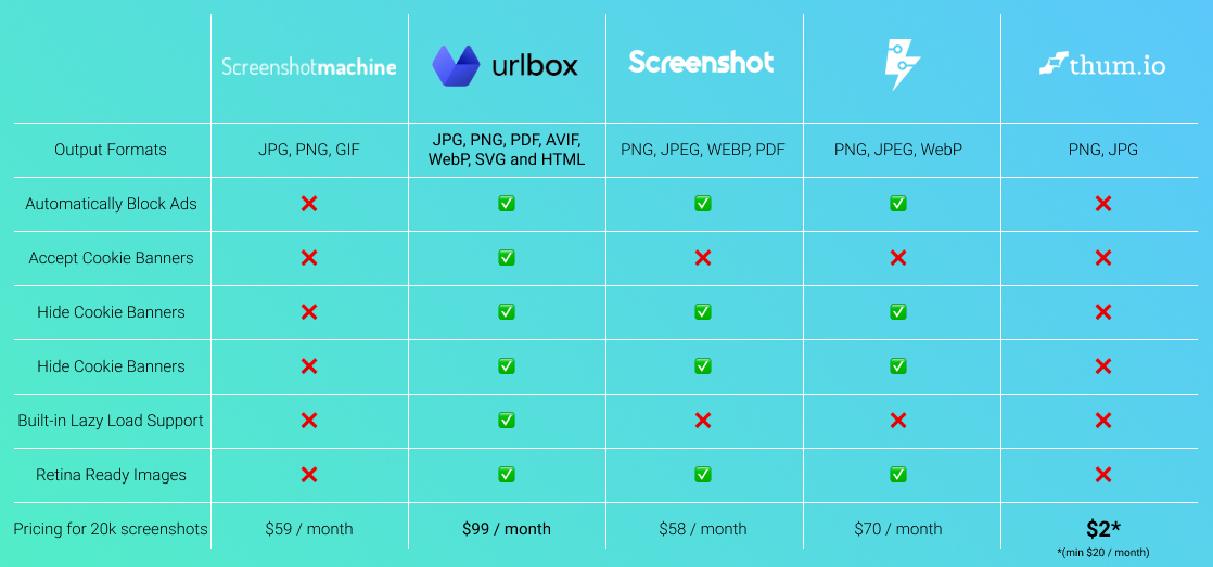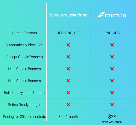 Last but not least is Thum.io, a screenshot API focused on thumbnails. I felt like I had to include it in this list as it is the cheapest option on the market.